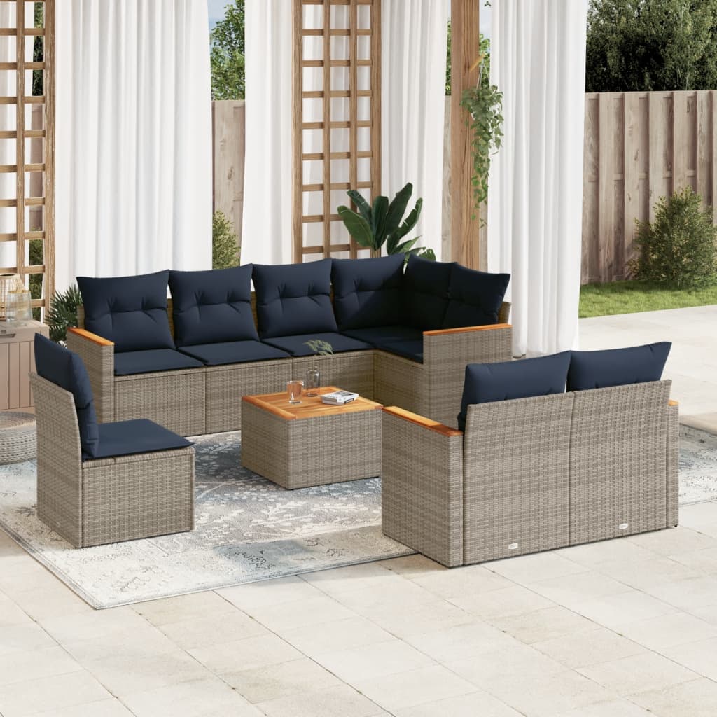 Set de sofás de jardín 9 pzas con cojines ratán sintético gris