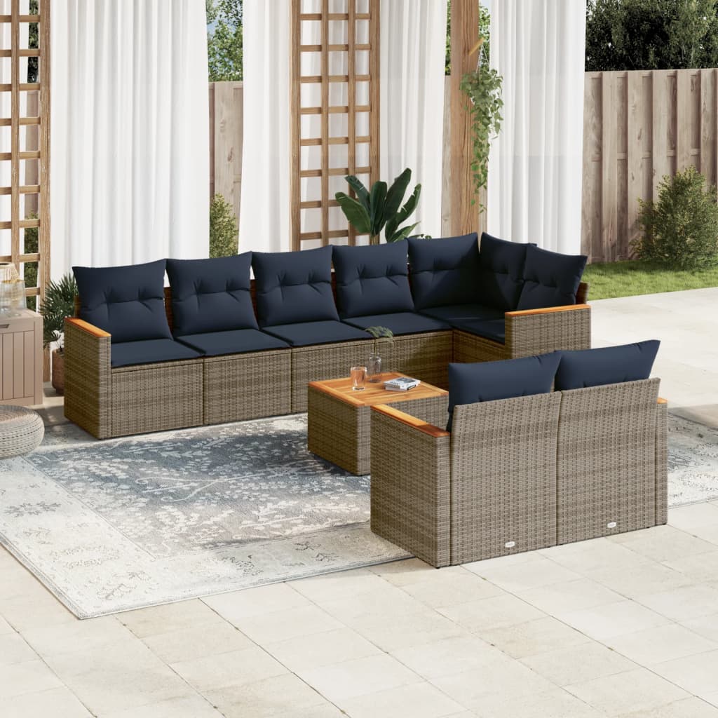 Set de sofás de jardín 9 pzas con cojines ratán sintético gris