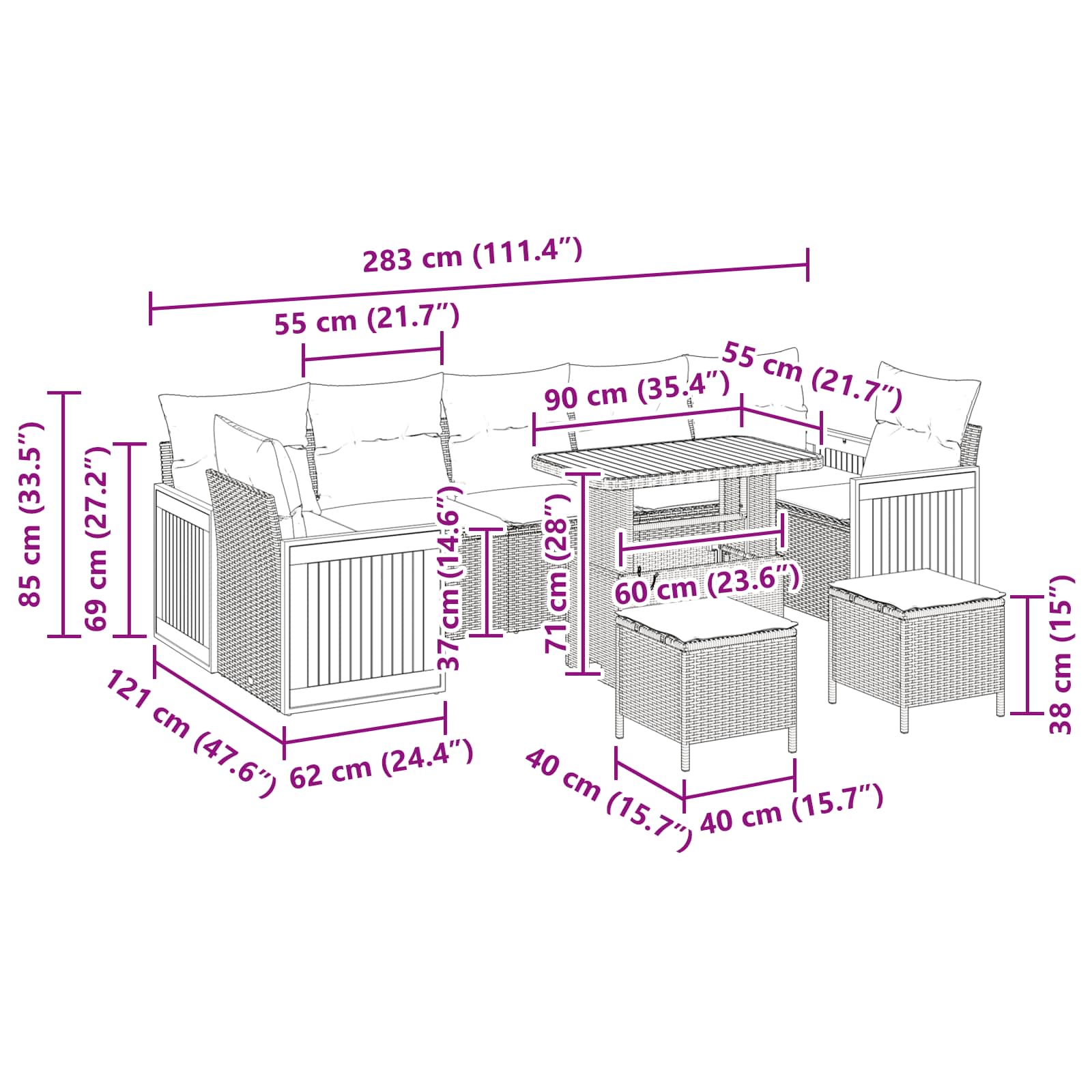 ¡Mira este conjunto de comedor para jardín con cojines! Es un mueble moderno que combina funcionalidad y estilo, perfecto para áreas exteriores. Con sus líneas limpias y su elegancia sencilla, se adapta genial a cualquier jardín o terraza, creando un espacio agradable para relajarte o socializar. La textura tejida contemporánea y los colores neutros realmente realzan tu espacio exterior, dándote estilo y confort para la primavera y el verano. Estructura Duradera: Este set de comedor para jardín tiene un marco fuerte de acero con recubrimiento en polvo. Es estable y está diseñado para durar, además es resistente a la corrosión, así que se mantiene bien con el clima. Cojines Cómodos: Los cojines están hechos de tela resistente a la intemperie, enfocándose en la comodidad y durabilidad. Son removibles para facilitar la limpieza, lo que suma a la practicidad del set. Diseño Versátil: El set incluye dos sofás con brazos, dos asientos de esquina y cinco asientos centrales, dándote un montón de opciones para organizar el espacio. Tiene reposabrazos y respaldos de poliratán curvados, combinando confort y buen aspecto. Tabla Funcional: También viene con una mesa de jardín de madera de acacia sólida, que es robusta y perfecta para comidas, juegos o tu café de la mañana. La madera de acacia le da un buen toque natural, haciendo que tu jardín se sienta más acogedor. Mantenimiento Sencillo: Mantener este conjunto en buen estado es fácil. Solo límpialo con un paño húmedo y cúbrelo cuando no lo uses para preservarlo. Un poco de cuidado hace una gran diferencia para que se mantenga atractivo por años.