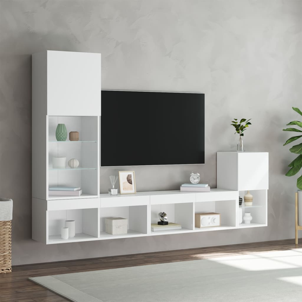 Estos muebles de TV de pared son la solución perfecta para la casa, con el fin de maximizar el espacio y mantener el suelo despejado. Material robusto: La madera contrachapada tiene una calidad excepcional, con una superficie lisa y también cuenta con fuerza, estabilidad y resistencia a la humedad.Luces LED RGB: El mueble de pared está equipado con increíbles luces LED RGB. Con diversos menús personalizables, puedes cambiar el color de las luces sin esfuerzo e incluso hacer que se ajusten automáticamente. Estas luces LED no sólo realzan el aspecto moderno del mueble de TV flotante, sino que también le dan un toque a la moda.Diseño de pared: El mueble de televisión se puede montar en la pared para ganar un plus de espacio de almacenaje. De este modo, podrás aprovechar al máximo el espacio del suelo y mantener la zona limpia.Amplio espacio de almacenaje: El mueble de TV flotante proporciona un amplio espacio para guardar organizados y al alcance de la mano tus objetos esenciales diarios, como libros, DVD, revistas, material multimedia, etc.Diseño versátil: Puedes usarlo como mueble de televisión o montarlo en la pared del lugar de trabajo para guardar herramientas u otros objetos varios de forma práctica. Además, transforma una pared vacía en una característica de diseño. Información útil:Los tornillos y los tacos para el interior de la pared no están incluidos. Recomendamos encontrar y utilizar tornillos y tacos adecuados específicamente para las paredes. Si no estás seguro, puedes consultar con un profesional. Lee y sigue cada paso de las instrucciones.El producto tiene un conector USB que necesita una fuente de alimentación USB certificada de 5 V (no incluida).
